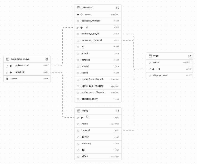 I initially built my database using Salesforce, but my Pokemon data didn't fit on the free Salesforce storage plan, so I migrated to Supabase which has a far more generous free tier. I also found it just a little easier to understand than Salesforce, which was appreciated as someone fairly new to database administration.